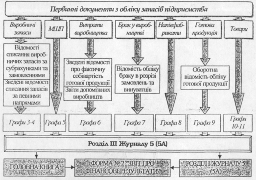Показники цих журналів використовуються під час складання звіту про фінансові результати. Також використовується відомість 5.1 В ній інформація про надходження і витрачання запасів узагальнюється за синтетичними рахунками, за центрами відповідальності та місцями виникнення витрат.