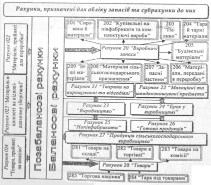Для відображення наявності та руху товарно-виробничих запасів призначені наступні балансові та позабалансові рахунки. (Рис.4.1)