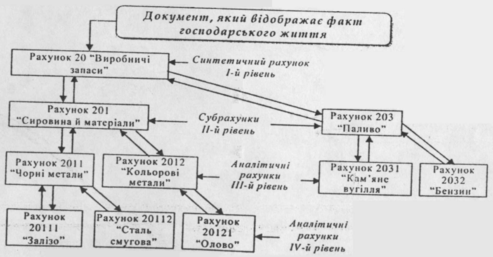 Приклад, який ілюструє взаємозв’язок синтетичних рахунків, субрахунків та аналітичних рахунків наведено на рис.4.2