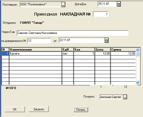 Данный документ создается при получении товароматериальных ценностей, является оправдательным документом при передаче ТМЦ.