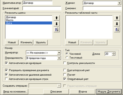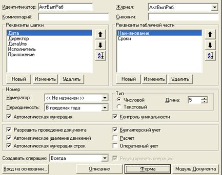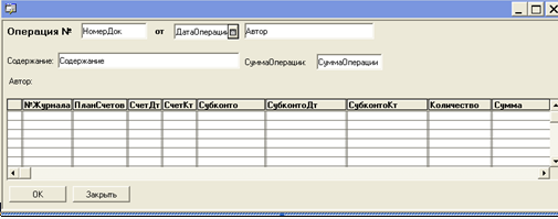 После определения всех реквизитов проводок можно перейти к созданию формы Операции. Вернемся в окно редактирования свойств объекта метаданных Операция. Вызовем окно редактирования формы операции.