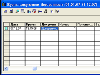 6.Создадим доверенность в 1С. Проведем документ. Он находит свое отражение в журнале по учету доверенностей "Доверенность"