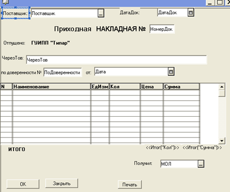 Отредактируем журнал ПриходныеНакладные. Добавим в него две графы – Кол из реквизита таблицы Кол, и Сумма из реквизита Сумма. Настроим форму журнала.