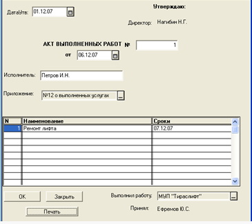 Таким же образом можно усовершенствовать форму документа "Акт выполненных работ", в части автоматизации ввода реквизитов "Исполнитель" и "Принял". Но данные преобразования возможны, лишь в том случае, если будут необходимые данные для создания справочников по лицам, выполняющим работы по договорам подряда, с учетом того, что на каждом предприятии-подрядчике свой перечень ответственных за работу лиц, в этом случае справочник будет многоуровневым. Реквизит "Принял" целесообразно подвергать изменению, если на предприятии помимо действующего ответственного за принятие работ по договорам - подряда, будут назначены еще лица, на которых будет возложена эта обязанность. Тогда по такому же принципу как описано выше, можно преобразовать этот реквизит. В целом можно усовершенствование и представление отчетов по счетам, но в этом случае нужно создать многоуровневые справочники, в которых будут отражены списки работников по отделам, структурным подразделениям. Дальнейшие усовершенствования можно разрабатывать и внедрять по мере необходимости в их применении.