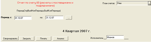 Создаем новый отчет "Счет60". Далее с помощью конструктора бухгалтерских запросов составляем форму отчета. Данный отчет будет иметь несколько кнопок, каждая из которых будет соответствовать конкретному счету, в частности:
