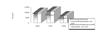 Рис. 2.1 Динамика производства и реализации молочной продукции ООО «КХ Нива» за 2006-2008 гг