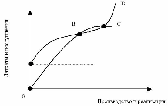 Горизонтальная пунктирная линия, начинающаяся в точке А, показывает затраты на обеспечение основных действующих производственных мощностей и, по мнению ученых-экономистов, является интерпретацией общих постоянных издержек компании. Управленческий анализ данной ситуации показывает, что форма кривой общих поступлений такова, что пересекается с кривой совокупных издержек в двух точках, то есть существуют два уровня выхода продукции, при которых общие затраты равны общим поступлениям, или есть две точки безубыточности.