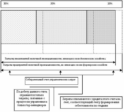Рассмотренный подход к организации управленческого анализа не учитывает затраты, связанные с организацией управленческого процесса. Данный вид расходов невозможно отнести к конкретной стадии распределения и анализа затрат, поэтому их необходимо распределять между стадиями затрат. Одним из способов является отнесение долями на каждую соответствующую стадию обратно пропорционально ее вкладу в образование себестоимости единицы изделия. Данный этап управленческого анализа затрат не относится к предпроизводственному, производственному и постпроизводственному анализу. Управленческий процесс является сопровождающим процессом, поэтому ему соответствует отдельный этап управленческого анализа. Процесс распределения затрат на управление на предприятиях молочной промышленности представлен на рис. 3.