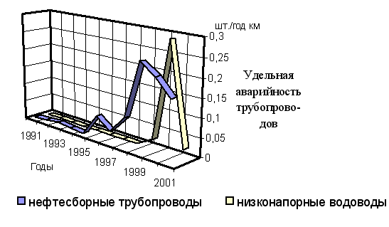 В период с 1997 по 2000 г.г. отмечено резкое увеличение числа порывов как на нефтепроводах, так и на водоводах. В 2001 г. в динамике аварийности наблюдался незначительный спад (рис. 5). Аналогичная закономерность прослеживается и для удельной аварийности трубопроводов (рис. 6, 7).