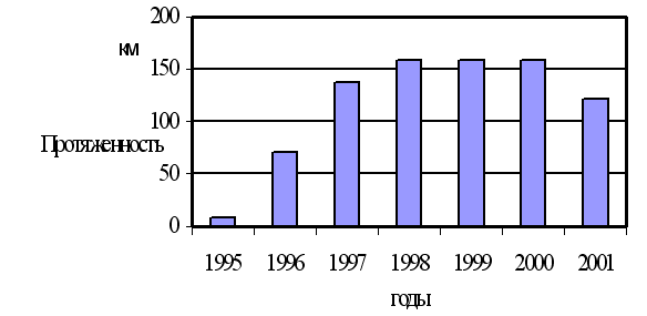 Протяженность трубопроводов, на которых была введена ингибиторная защита металла, достигла максимального значения к 1998 г. и сохранялась на этом уровне вплоть до 2000 г. В 2001 г. на ряде участков подача ингибитора была прекращена (рис. 9).
