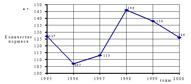 С 1995 по 2000 г.г. на Вятской площади произошло 1055 порывов трубопроводов, из них на водоводах v 201 (19,0 %), на выкидных линиях - 757 (71,8 %) и на нефтесборных трубопроводах - 97 (9,2 %). Доля отказов по причине коррозии составляет 98,4 %, из которых 74,4 % аварий произошло вследствие коррозии наружной поверхности труб, и 24,0 % - внутренней.