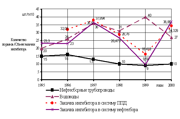 Рис. 13 - Аварийность трубопроводов и объем закачки ингибиторов