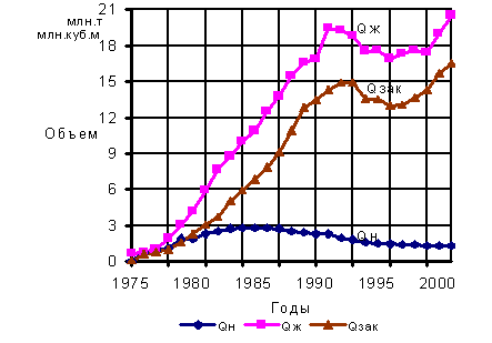 Qн - добыча нефти, млн. т; Qж - отбор жидкости, млн. м3; Qзак. - закачка воды, млн. м3