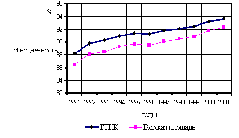 Последние десять лет на Вятской площади, как и на месторождениях Западной Сибири, наблюдается прогрессирующий рост обводненности (рис. 11). Хотя средняя обводненность продукции увеличилась на 5 %, что значительно меньше, чем на Ватьеганском и Южно-Ягунском месторождениях, ее среднегодовой уровень по Вятской площади почти на 20 % выше.