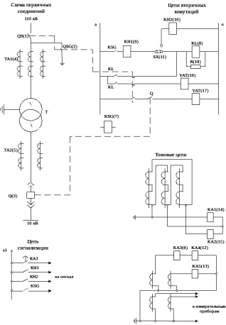 Пользуясь справочником ( [2] стр. 376 – 382 ) принимаем схему защиты на переменном оперативном токе с реле прямого действия для трансформаторов 110/10 кВ. Схема защиты приведена на рис.9.1