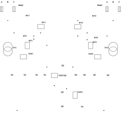 фаза А трансформатора TV2, контакт КТ1, электромагнит отключится: выключаются YAT Q1, блок – контакт выключателя Q1, фаза В трансформатора TV2. Выключатель Q1 отключается, при этом блок – контакты выключателя Q1 в цепи электромагнита включения межсекционного выключателя Q3 замыкаются, тогда по цепи: фаза А трансформатора TV2, блок – контакты Q1; фаза В трансформатора TV2. Выключатель Q3 включится и первая секция шин получит питание. При этом нужно иметь в виду, что потребители третьей и частично второй категории должны быть отключены.