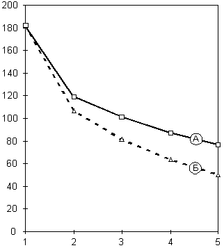 | Рис. 2. Прогнозное изменение 2-й возрастной расчетной лесосеки и объемов лесопользования на территории Костомукшского горсовета вне пределов "зоны моратория" по 10-летним ревизионным периодам (1 - текущий, истекающий в 2002 г.): |
