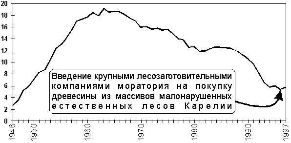 | Рис. 1. Динамика объемов заготовки древесины в Карелии за послевоенный период. В связи с истощением наиболее доступных и продуктивных лесов со второй половины 60-х г.г. объемы заготовки древесины постоянно снижались и достигли минимального уровня еще до начала активной деятельности неправительственных природоохранных организаций в Карелии |