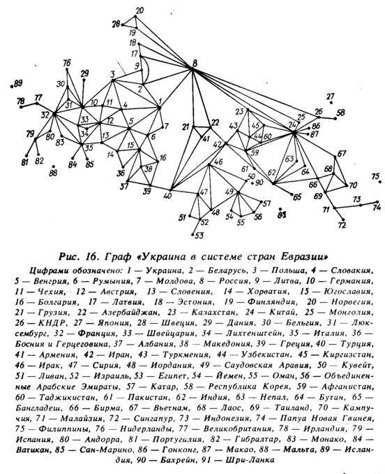 5) длина диаметра графа, т. е. самое короткое расстояние — количество ребер между наиболее отдаленными вершинами,— равна 11. Диаметр «пересекает» следующие страны: