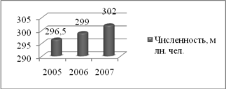 По численности населения США занимают третье место в мире (302 млн. чел.). В течение только XX в. он возрос в 3,7 раза. (9) За последние три года численность населения США выросла на 5,5 миллионов (см. Рис. 2).