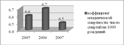 Рис. 3 Динамика коэффициента младенческой смертности за 2005-2007 года, число смертей на 1000 рождений6