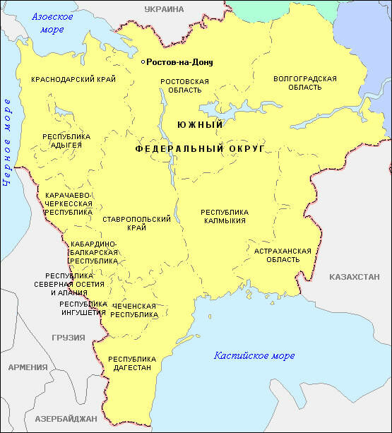 В состав Южного федерального округа входят: Республика Адыгея (Адыгея), Республика Дагестан, Республика Ингушетия, Кабардино-Балкарская Республика, Республика Калмыкия, Карачаево-Черкесская Республика, Республика Северная Осетия - Алания, Чеченская Республика, Краснодарский край, Ставропольский край, Астраханская, Волгоградская и Ростовская области.