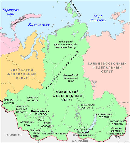 В состав Сибирского федерального округа входят республики: Алтай, Бурятия, Тува и Хакасия; Алтайский и Красноярский края; Иркутская, Кемеровская, Новосибирская, Омская, Томская, Читинская области; Агинский Бурятский, Таймырский (Долгано-Ненецкий), Усть-Ордынский Бурятский и Эвенкийский автономные округа.