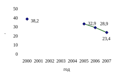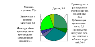 В последние годы наблюдается значительное уменьшение доли машиностроительной отрасли в общем объеме реализованной продукции промышленности, о чем свидетельствует график, приведенный на рис. 2.