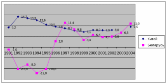 Как видно из рис. 4 на протяжении 1991-1997 гг. темпы роста ВВП Китая намного превышали темпы роста ВВП Республики Беларусь. С середины 1997 г. различия между странами несколько сократились. Если посмотреть на темпы роста ВВП КНР, то они не так резко изменяются на протяжении 1991-2004 гг., нежели темпы роста ВВП Беларуси, это свидетельствует об относительной стабильности экономики КНР.