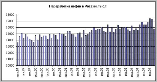 С учетом объемов добычи нефти, экспорта и внутреннего спроса на нефтепродукты, объем первичной переработки нефти в 1 квартале 2005 года оценивается в размере 50 млн т (105,5% к уровню 2004 года). Намечается произвести 7,8 млн т автомобильного бензина (108,3%), 14,5 млн т дизельного топлива (105,8%) и 14,1 млн т топочного мазута (102,9 процента).
