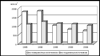 В 2006 году забор воды из природных водных объектов республики составил 1730 млн. м3, а подземных - 1010 млн. м3. При этом забор воды из водных объектов для использования сократился на 31,8 млн. м3. Данная тенденция, впервые отмеченная в 1995 г., в последующие годы только нарастала (рис. 2.1).