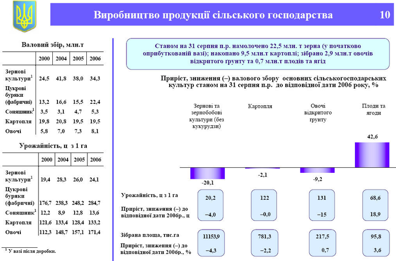 Аграрними підприємствами зібрано 2,1 млн.т насіння соняшнику при середній урожайності 14,0 ц з 1 га (торік – відповідно 2,6 млн.т та 15,0 ц); цукрових буряків – 3,5 млн.т, що на 42% менше проти минулорічного (при зростанні урожайності до 303 ц з 1 га проти 280 ц – торік, зібрані площі майже вдвічі менші, ніж на початок жовтня 2006р.).