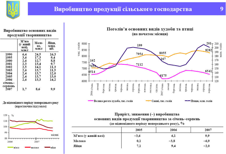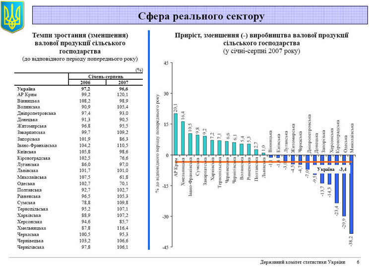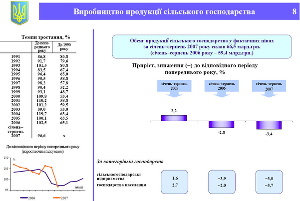 Обсяг продукції сільського господарства в усіх категоріях господарств за січень-вересень п.р. проти відповідного періоду 2006р. скоротився на 5,1%, у т.ч. в аграрних підприємствах – на 6,4%, у господарствах населення – на 4,4%, що обумовлено зменшенням виробництва продукції рослинництва, особливо зернових культур.