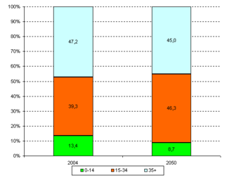 Рисунок 1 - Возрастная структура внешних мигрантов в 2004 году (фактические данные) и в 2050 году (прогноз)
