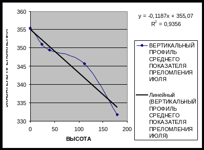 По средним значениям N на высотах 0, 24, 40, 112, 180 м был построен график вертикального профиля показателя преломления воздуха в июле (см. рисунок 4). Из графика видно, что показатель преломления убывает с высотой. Это происходит потому, что (если опять же анализировать выражение (9) ) Р и е с высотой уменьшаются, а Т увеличивается до определенного уровня, а потом уменьшается. В слое от 0 до 24 м идет достаточно выраженное падение N (градиент здесь равен – 0,183 N – ед/м). В слое от 24 до 40 м немного уменьшается интенсивность падения N, но не сильно (градиент составляет – 0,100 N–ед/м). А вот от 40 до 112 м наблюдается самое маленькое (незначительное) уменьшение N с высотой (градиент слоя составляет всего – 0,053 N – ед/м). Начиная со 112 и до 180 м наблюдается самое сильное падение N с высотой (градиент здесь самый большой и равен – 0,204 N – ед/м). Разница между нулевым уровнем и высотой 180 м составляет 23,7 N – ед/м (такая небольшая разница скорее всего обусловлена сглаженным среднемесячным ходом влажности – изменения ее тоже очень маленькие по вертикали).