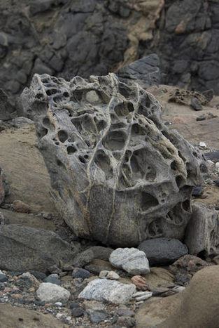 Самый эффектный процесс разрушения скал — это ячеистое выветривание. Раньше оно считалось характерным для жарких, засушливых пустынь. Но, оказывается, оазисы Антарктиды — его вторая родина. Если в жарких пустынях кружева углублений на скалах формируются под воздействием влекомых ветром песчинок, то в ледяной Антарктиде, кроме этого, на скалы воздействуют кристаллы снега, твердость которых при низких температурах не уступает твердости минеральных частиц. Но, пожалуй, наиболее активную роль в образовании этих форм играют процессы замерзания и оттаивания. В солнечный день снег, попавший в ячеи, тает, ночью вода замерзает. Это повторяется многократно.