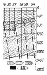 1 – глины; 2 – песчаники; 3 – пески 4 – нефтяные залежи; 5 – газовые залежи