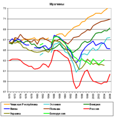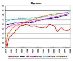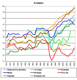 На российских кривых ясно видны колебания, которые возникли во второй половине 1980-х годов, когда во время антиалкогольной кампании резко, но на короткое время снизилась смертность. Поэтому продолжительность жизни в этот период выросла на 2-3 года. Антиалкогольная кампания не искоренила пьянства, она лишь позволила кое-кому чуть-чуть продлить жизнь. Когда же кампания сошла на нет, эти люди, относящиеся к группе риска, вернулись к своим привычкам и быстро "добрали" свое. Это привело к новому подъему смертности и, соответственно, к снижению продолжительности жизни.