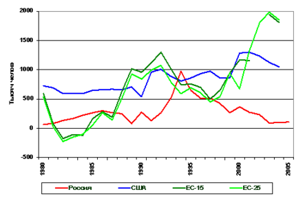 В России за весь период сокращения населения с начала 1990-х годов миграция компенсировала около половины его естественной убыли. Но этот сравнительно высокий вклад миграции достигнут в значительной мере за счет ее всплеска в первой половине 1990-х годов, потом этот вклад резко сократился. В 2003 г. миграционный прирост населения России упал ниже 100 тыс. человек, а естественная убыль находилась на уровне 800-900 тысяч в год. В 2005-2006 гг. наметился некоторое увеличение миграционного прироста, но далеко не такое, какое нужно, чтобы покрыть естественную убыль населения, пусть даже и несколько сократившуюся.