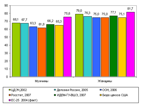 Что ожидает нас в обозримом будущем? Есть разные прогнозы ожидаемой продолжительности жизни россиян до 2025 г. Обычно они делаются в разных вариантах, на рис. 29 представлены самые оптимистические из них (за исключением прогнозов Росстата, ООН, и Бюро цензов США, по которым опубликован только один сценарий) не рискуют предсказать рост продолжительности жизни в России даже до нынешнего усредненного уровня стран Европейского Союза, который также показан на графике.