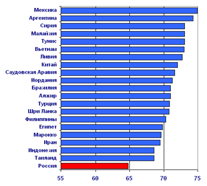 Рисунок 27. Продолжительность жизни при рождении для обоих полов в России и некоторых развивающихся странах, 2000-2005 гг.