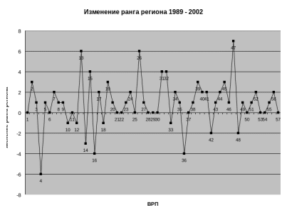 Для того, чтобы проследить динамику численности населения по субъектам РФ, а также зависимость роста от объема ВРП составим график изменения ранга регионов по численности, составленных в порядке убывающей людности на 1989 и 2002 гг.