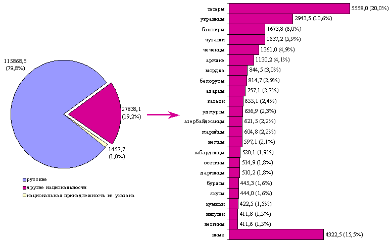 Сколько граждан России, нерусской национальности, проживает в Москве. Вычтем из 10,5 млн. 4.2 млн. великороссов, украинцев, белорусов и 4 млн. иностранцев. Получим цифру в 2 млн. 300 тыс. человек. Большинство (1.900.000. В 1989 г. эти же народы - 350.000 человек) из них составляют татары (900.000. В 1989 г. - 157.376), евреи (500.000. В 1989 г. - 174.728), чеченцы (300.000. В 1989 г. - 2.101), башкиры (100.000. В 1989 г. - 5.417), дагестанцы (100.000. В 1989 г. - менее 10.000). Все остальные (чуваши, мордва, осетины, марийцы, коми и др.) - 400.000 чел.