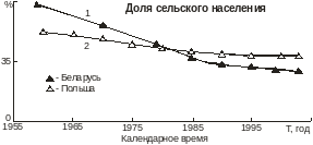 На рис. 1 показана динамика процентной численности жителей села по отношению ко всему населению республик. Как видно, доля сельских жителей непрерывно уменьшается, причем наиболее быстро этот процесс идет в Беларуси. Так, если в 1959 г. процент сельского населения в Беларуси составлял 69,2 (более двух третей), то через 40 лет, к 1999 г., он уменьшился более чем наполовину, до 30,7. Практически в тоже время (с 1960 по 2000 гг.) в Польше доля сельских жителей снизилась с 51,7% (чуть больше половины) до 38,1% – только на четверть. Последние 15 лет процент жителей села в Польше удерживается на постоянном уровне 38,2 – 38,4% (рис. 1, кривая 2), а в Беларуси эта величина продолжает снижаться, хотя заметно медленнее, чем в 50-70-е гг. (рис. 1, кривая 1).