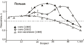 На рис. 4 (кривая 3) приведена возрастная зависимость показателя n для всего населения Польши (перепись 1988 г.). В области младших возрастов (примерно до 22,5 лет) величина n является одинаковой для всех жителей республики и составляет около 1,05. Общеизвестно [1], что при рождении число мальчиков примерно на 5% превышает число девочек. Это соотношение в Польше сохраняется до возраста 22,5 лет. В дальнейшем с увеличением возраста поколений показатель n начинает заметно снижаться и при возрасте старше 40 лет становится равным 1. Далее снижение показателя n продолжается со все возрастающей скоростью. Причина уменьшения коэффициента соотношения полов заключается в том, что мужская часть населения в большей мере, чем женская, подвержена смертности (из-за болезней, участия в военных конфликтах, травматизма, вредных привычек и т. д.). В результате число женщин в поколении со временем становится преобладающим. Чем старше возраст поколений, тем бóльшим является это преимущество. Неожиданным явилось то, что возрастная зависимость показателя n для жителей села (рис. 4, кривая 1) не совместилась с аналогичной кривой для всего населения республики (рис. 4, кривая 3). В широком интервале возрастов (15-60 лет) значение n в сельских группах населения оказалось выше. Максимальное значение n на кривой 1 (рис. 4) составляет около 1,19 (возрастной интервал 30-34 года). Это означает, что при проведении переписи 1988 г. в данном диапазоне возрастов на 6 мужчин в селе приходилось примерно 5 женщин. Является очевидным, что в городских группах населения показатель n будет ниже, чем в целом по республике, то есть в городе существует дефицит мужчин.