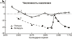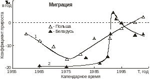 На рис. 3 показана динамика коэффициента миграционного прироста в Польше (кривая 1) и Беларуси (кривая 2).