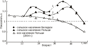 Деформация половой структуры из-за миграции сельского населения характерна и для Беларуси, причем в Беларуси степень деформации значительно выше. На рис. 5 (кривые 1, 2) представлены возрастные зависимости показателя n для сельского населения республик на начало 2004 г. Как видно, в интервале возрастов 15-48 лет значения величины n для сельского населения Беларуси выше, чем соответствующее значения в Республике Польша. Максимальное значение показателя n для Беларуси составило 1,20 (возрастной интервал 40-44 года). Для населения Польши в этом диапазоне возрастов оно составляет только 1,13.