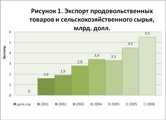 АПК играет всё более активную роль на внешнем рынке. Экспорт сельскохозяйственной продукции и продовольствия достиг более 5 млрд. долл. (Рисунок 1) .