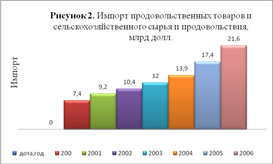 Проблемы на селе, прежде всего, связаны с невысокой доходностью сельскохозяйственных товаропроизводителей в условиях сохраняющегося диспаритета цен, низкой производительности и оплаты труда, недостатка финансовых ресурсов для освоения новейших технологий, высокой доли импортной продукции, а также ненадлежащего состояния социальной сферы. Если в 2005 году цены на сельскохозяйственную продукцию выросли на 9,6%, то на промышленную – на 15,7%. Аналогичная ситуация сохранилась и в 2006 году. Так цены на реализованную сельскохозяйственную продукцию по сравнению с 2005 годом увеличились на 10%, а на промышленную – на 21%. Диспаритет цен ещё более углубился. В результате, ежегодно из сельского хозяйства изымается до 80 млрд. руб. Сдерживающим фактором развития отечественного производства является рост объёмов импорта сельскохозяйственной продукции и продовольствия. По данным таможенной статистики, в 2006 году объём импорта продовольственных товаров и сельскохозяйственного сырья для их производства составил21,6 млрд. долл., или вырос по сравнению с 2005 годом на 24% (Рисунок 2).