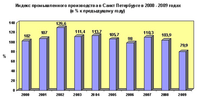 Индекс промышленного производства в Санкт-Петербурге по итогам 2009 года составил 79,9%. Динамика индекса промышленного производства даже в докризисный период не всегда в полной мере учитывала сложность структуры промышленности Санкт-Петербурга, которая характеризуется наличием крупных единичных заказов машиностроительных предприятий с длительным циклом изготовления. Это демонстрирует нижеприведенная гистограмма с разнонаправленной динамикой индекса: